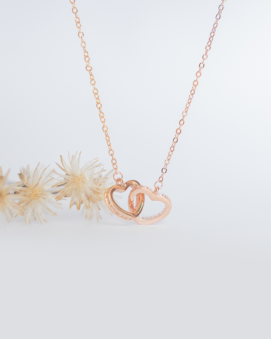 Cadena con dijes de corazones entrelazados.