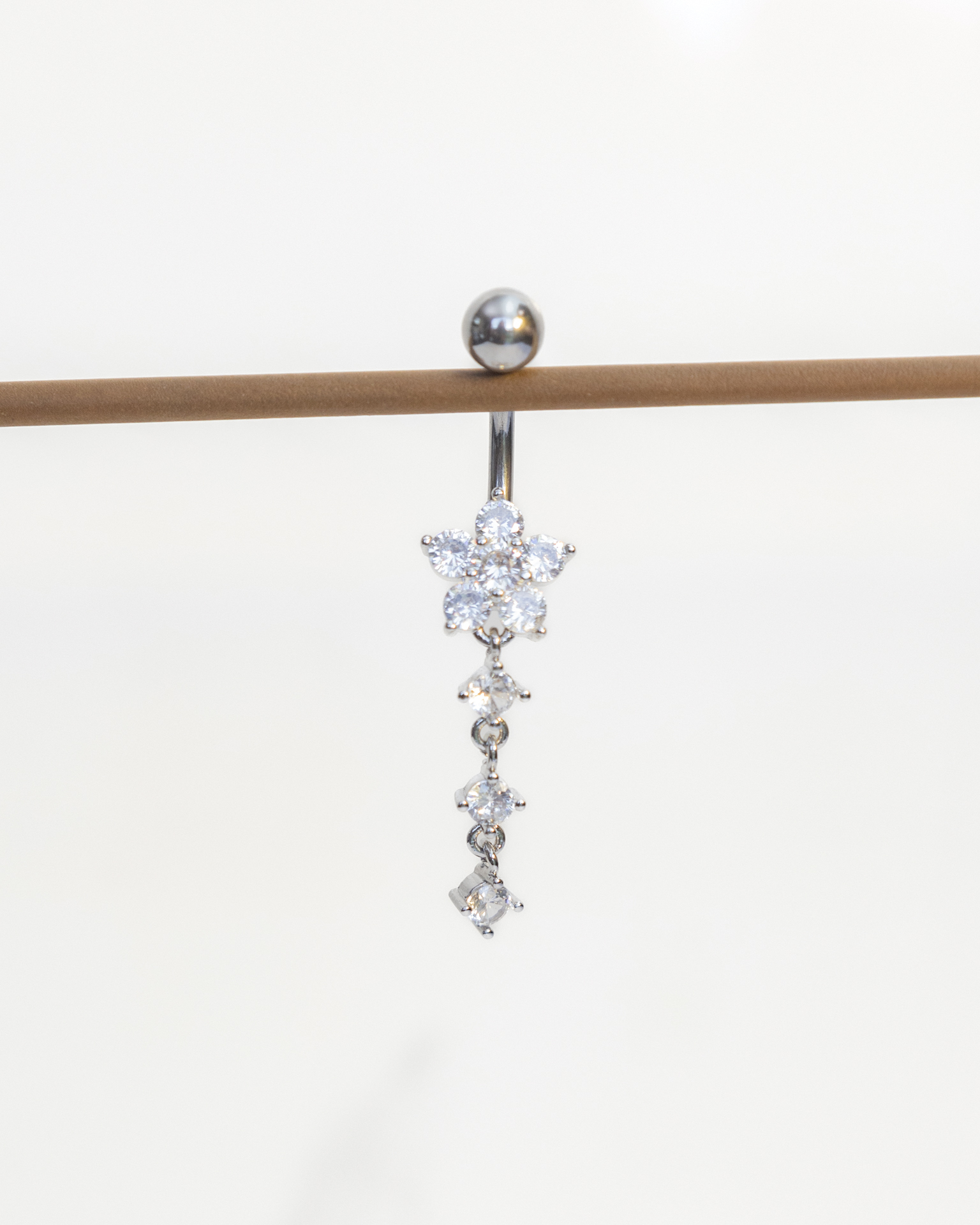 Piercing para ombligo con colgante de flor color plateado.